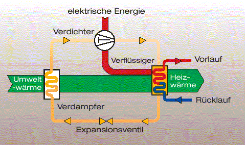 Und so funktionierts: Die Wärmepumpe ähnelt dem Funktionsprinzip eines Kühlschrankes. Sie gewinnt kostenlose Umweltwärme aus Erde, Luft oder Wasser und führt sie einem Wärmetauscher (dem Verdampfer) zu. Hier befindet sich ein Umweltfreundliches flüssiges Kältemittel, das so genannte Arbeitsmedium. Es kann die angelieferte Wärme aufnehmen und verdampft. Ein Verdichter übernimmt das nunmehr gasförmige Arbeitsmedium und komprimiert es. Durch den gestiegenen Druck steigt die Temperatur. Ein zweiter Wärmetauscher (der Verflüssiger) speist die Wärme in das zentrale Heizsystem ein. Das Expansionsventil am Ende des Systems sorgt schließlich für den Druckabbau - der Zyklus kann aufs Neue beginnen.